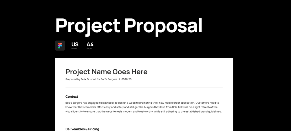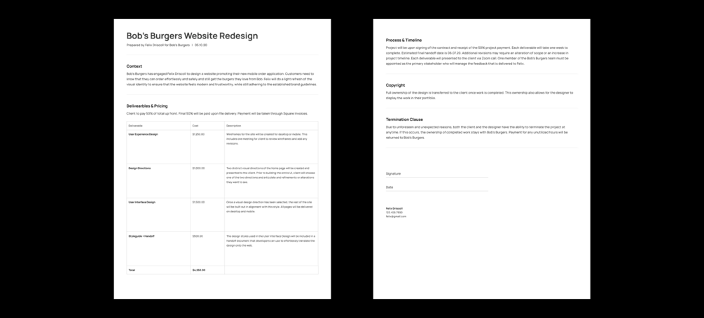 This is a copy of a project proposal I have used to generate over $100k in freelance revenue since 2017. This is a simple template intended for projects with an overall budget of $10k or less. In it, I explain how to outline project context, deliverables, process, timeline, copyright, and termination clauses